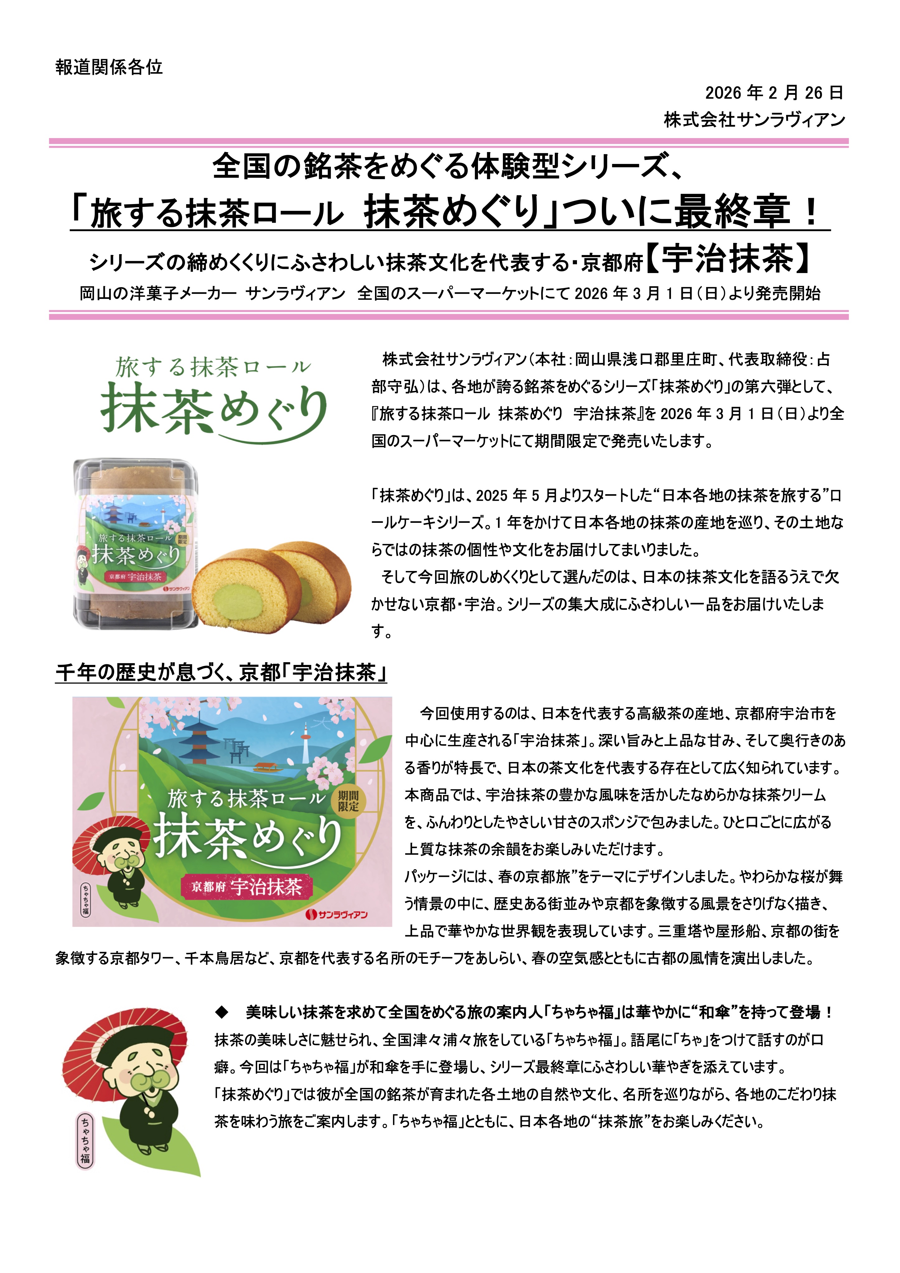 株式会社サンラヴィアン(本社:岡山県浅口郡里庄町、代表取締役:占部守弘)は、各地が誇る銘茶をめぐるシリーズ「抹茶めぐり」の第六弾として、『旅する抹茶ロール 抹茶めぐり 宇治抹茶』を2026年3月1日(日)より全国のスーパーマーケットにて期間限定で発売いたします。